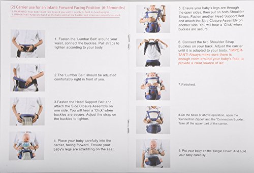 -. Feature : Approx Dimensions::L11.8",H9.8",W7.1"(L30,H25,W18cm)&Waist size is 51"(130 cm); / Max capacity is 19.9 kg for baby who is from 3 to 36 months; / 3 designs with sling, face in, face out, and backpack positions;&Detachable Hip Seat / toddler Carrier; / Easy to use, Fits parents perfectly and securely with only a few adjustments; / This product has been certified by SGS,Please follow and comply with the instructions to ues this baby carrier.