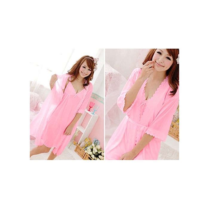 N'CREA (클레어) CREA 청초 귀여운 네글리제(neglige) 원피스 롱 캐미숄 & 가운 세트 ( 로즈 핑크 )