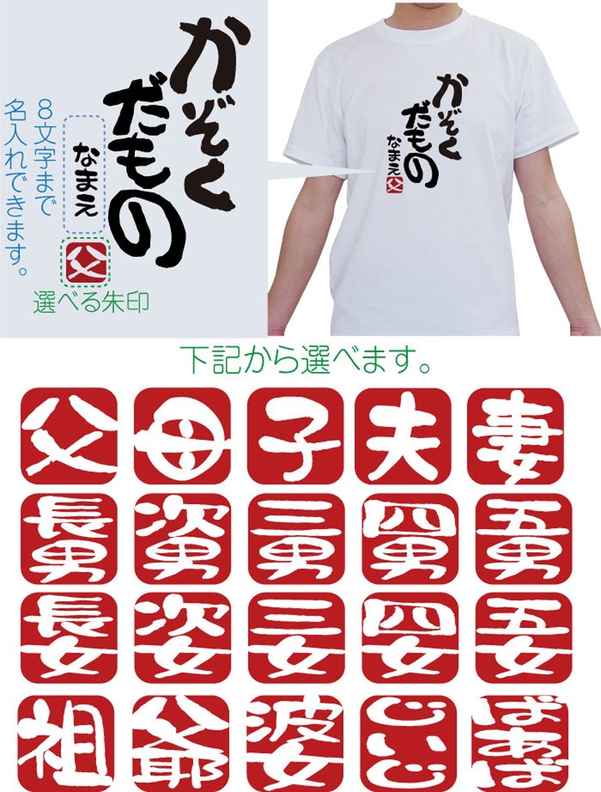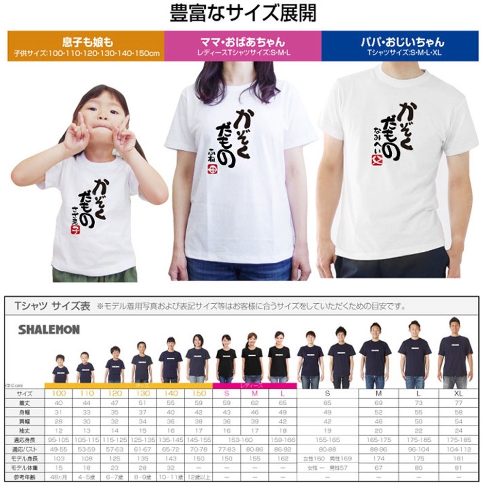 家族で集合写真はいかが?とっても思い出に残る名入れTシャツです。ご家族全員の名前を入れてお揃いでいがオススメ!おじいちゃんや、おばあちゃんも一緒に大家族でも対応可能なデザインです。赤印の部分が、全20種類ございますので、ご選択の上ご購入してください。「なまえ」の部分に8文字までお好きな文字を名入れします。 ※価格は1枚になります。ペアセットではございませんのでご注意ください。シャレもん商品ですので、もちろん高品質!しっかりとした厚手生地5.6オンスのTシャツがベースで品質に自信ありです。