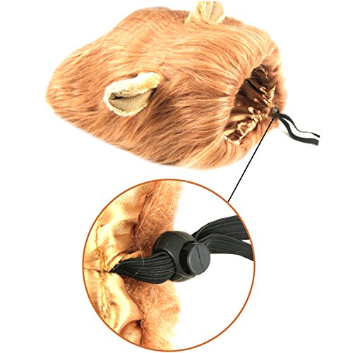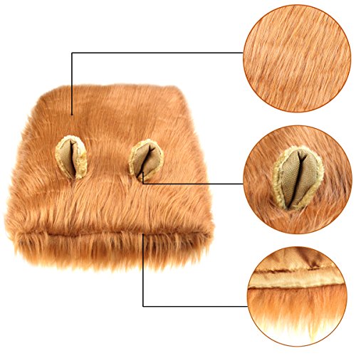 -. Feature : A Great Christmas Gift - Perfect for Any Festival: Halloween, Christmas, New Year party, adding a festive atmosphere,Photography. Wearing this lion wig, your pet dog will be very funny and cool, always be set to be the eye-catcher of the event. A Must-have gift! / Lion Mane Size - Diameter:36 CM (14 INCH), Length:37 CM (14.5 INCH). They are designed to fit perfectly for large or medium sized pet's Neck Girth: 22"-31" (from 60cm to 80cm). The fake fur is easily folded for travel and keeps the shape well. / Golden Brown with Ears - 1 pc/ package. They will blend completely with your pet's fur shade?with ears and a tail your pet will be a verisimilar lion, we are confident that you will absolutely love your pet look with this hat on. / Soft & Comfortable Material- For animal protection, we don't use real animal wool. They are made of high quality light-weight faux fur and polyester, healthy and non-toxic,won't hurt dogs'fur or skin. Lion mane touch smooth, soft and comfortable, keeping your dog warmer, giving your friend 100% love. These durable material make sure they can bear daily resistance from rolling, chewing, running and so on activities, and last long long. / Easy to Wear & Wash - Adjustable elastic drawstring and button fixed according to dog nech to make sure your dog is comfortable. The lion mane will not easy to slip off and your dog looks like a real lion. Simply wash with warm water with mild soap, air dry. The wig is still very supple after washing and drying.
