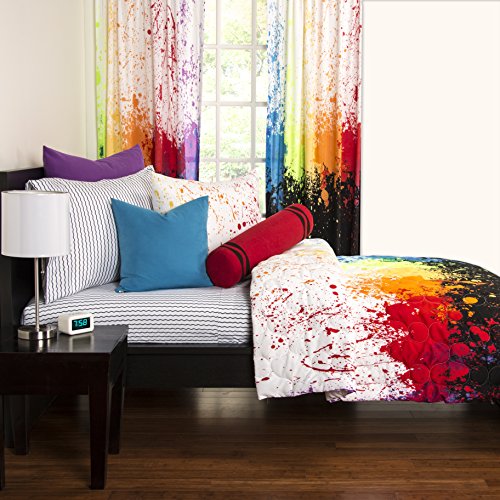 Featuring a pattern of vivid bursting color splashed over a black and white background; this graphic pattern is sure to impress. The comforter reverses to a solid white and features a unique geometric stitching pattern that further adds to its appeal. Crafted of a soft brushed microfiber this comforter is luxurious to the touch. This set includes a comforter and matching shams (only one sham in twin set). comforter dimensions: twin: 63x 90, Full/Queen: 88x 90. Shams measure at 26x 20. This medium weight comforter is filled to 150 GSM and is ideal for all year use. 1 year limited manufacturers warranty. Imported.Feature