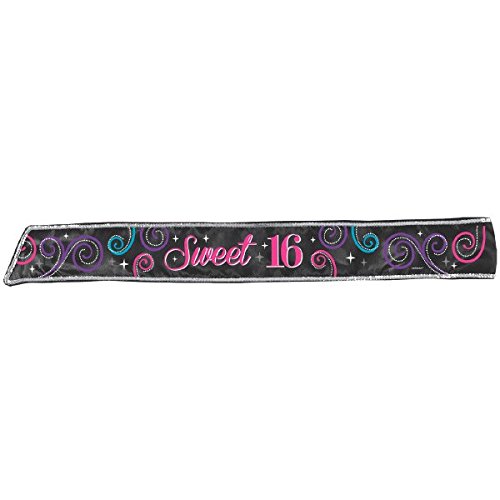 -. Binding : Toy -. Brand : Amscan -. Color : Multi Color -. EAN : 0013051539245 -. Feature : Features silver sequin border and flowing pink script that reads "Sweet 16" on black background with pink, purple and blue swirls surrounding the text. / Lightweight and easy to wear over her beautiful birthday outfit / Sash measures 30" / Perfect for making her feel special on her milestone day. -. IsAdultProduct : 0 -. Label : TradeMart Inc. -. Manufacturer : TradeMart Inc. -. Model : 341466 -. MPN : 341466 -. PackageQuantity : 1 -. PartNumber : 341466 -. ProductGroup : Toy -. ProductTypeName : TOYS_AND_GAMES -. Publisher : TradeMart Inc. -. Size : 30" -. Studio : TradeMart Inc. -. Title : Chic Sweet Sixteen Birthday Celebration Fabric Sash Party Accessory (1 Piece), Multi Color, 30". -. UPC : 013051539245 -. Warranty : No Warranty