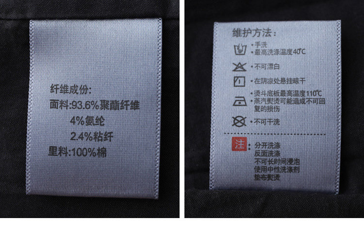 洗涤标准:不可浸泡不可漂白悬挂晾干40℃以下手洗110℃以下反面熨烫不可干洗
