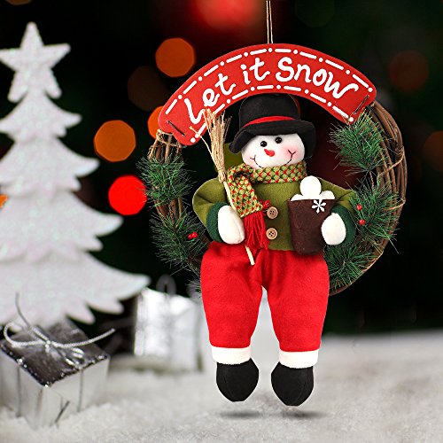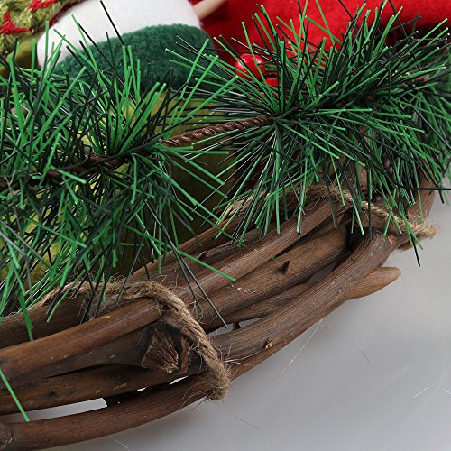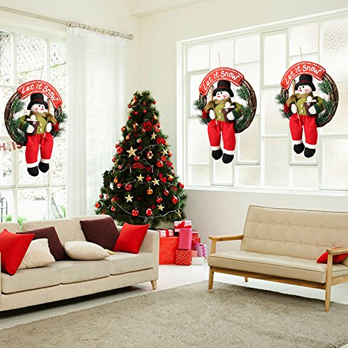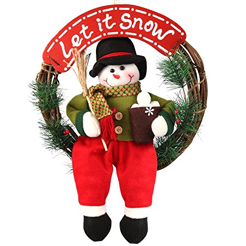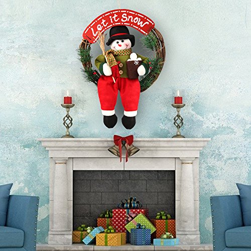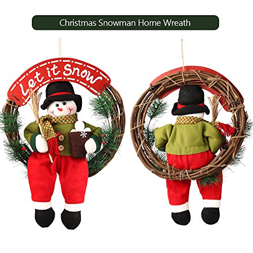 This Snowman Christmas Wreath measures about 14" in diameter and 1.2" deep. Artificial Wreath made from rattan, plastic pine leaves and plush snowman, poisonless and harmless