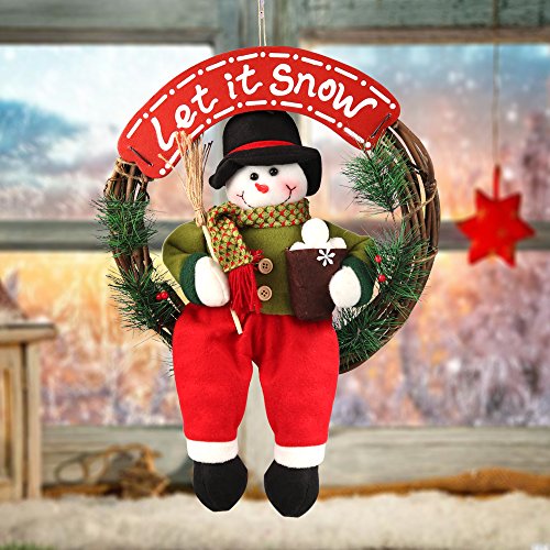 Delicate Design - Large plush delightful snowman on a sturdy natural rattan base; Green PVC pine leaves and wording “let it snow” board in eye-catching white and red color