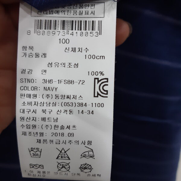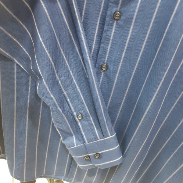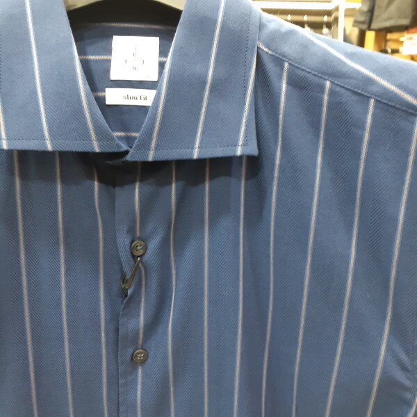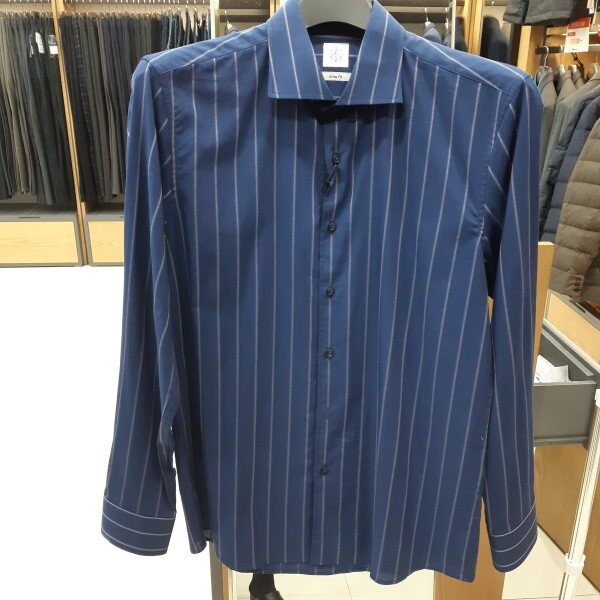 네이비 헤링본 바닥에 옐로우 블루컬러 스트라이프가 멋스러운 셔츠 와이드카라 디자인으로 수트와 매치했을때 한층더 포멀하고 세련된 느낌