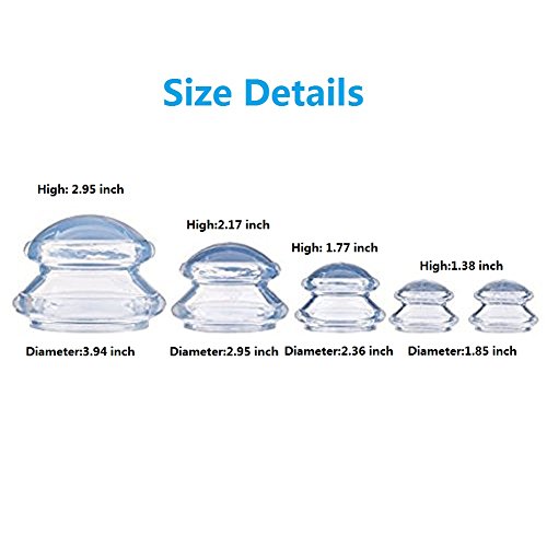 √ 5 CUPS IN DIFFERENT SIZE - Upon designing this massage cup set, we tried to make it extremely convenient to be used by all. 1 X-LARGE(3.9" diameter), 1 LARGE(3" diameter), 1 MEDIUM(2.4" diameter), 2 SMALL(1.85" diameter). Large cups fit for large areas, like back, chest. And small cups fit for small areas, like face, knees.