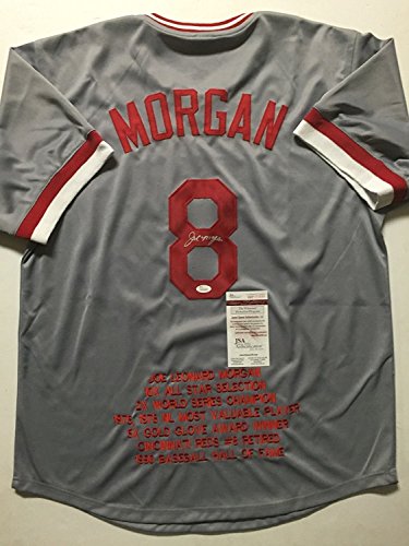 Autographed/Signed Joe Morgan Cincinnati Reds Grey Stat Baseball Jersey JSA COA