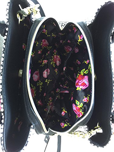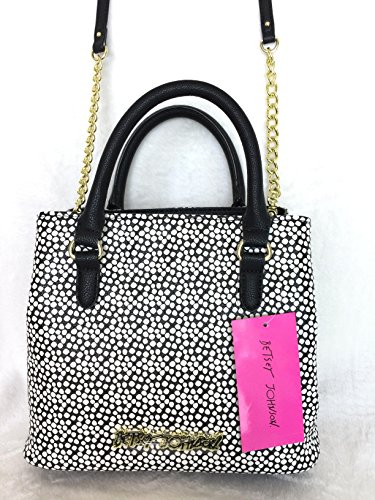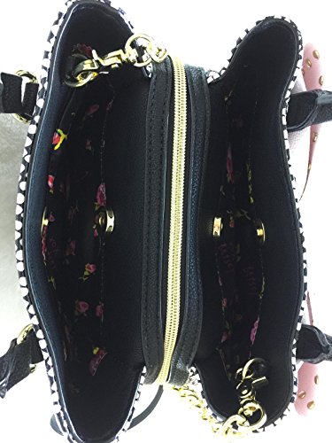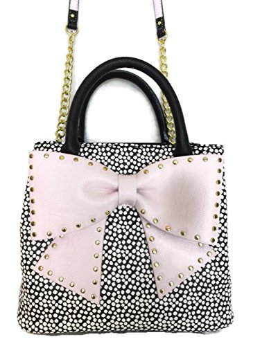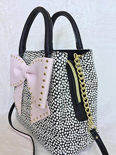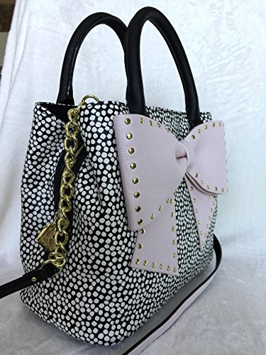 Black/White Spot PU Leather Body & Trim with Front accented with Big Blush color bow & Back side has Betsey Signature name plate. Signature Polyester Floral inner Lining. Outside Dimensions of the purse are: Length: 10.5" x Height: 8" x Depth: 5.5" . Short Dual Strap drop: 4.5".Longer chain-leather combo strap has approx 20-23" drop.