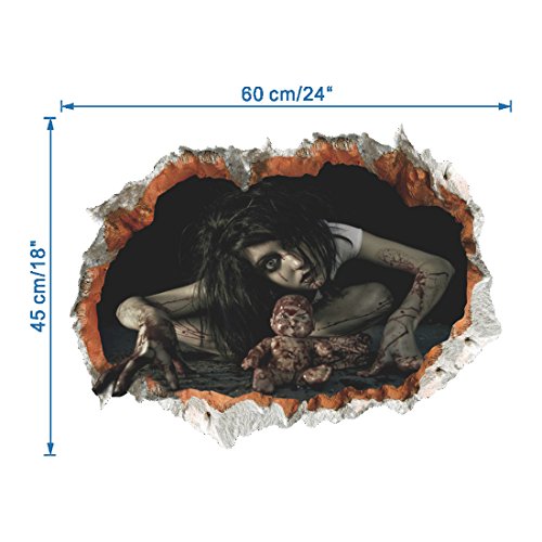 -. Feature : Material: PVC; Finished size :24 x 18 inches. / Self-adhesive, waterproof and removable without residue. / Applies to any clean/dry/flat surface / Environment-friendly, Non-toxic , Non-fading, Waterproof. / Fantastic Halloween decor: It looks like a real hole in the wall and a scary girl ghost in the window, giving an amazing touch to your home interior