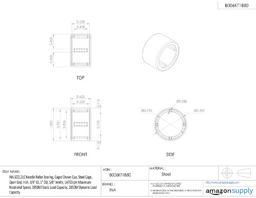 INA SCE1210 Needle Roller Bearing, Caged Drawn Cup, Steel Cage, Open End, Inch, 3/4" ID, 1" OD, 5/8" Width, 14700rpm Maximum Rotational Speed, 3950lbf Static Load Capacity, 2850lbf Dynamic Load Capacity