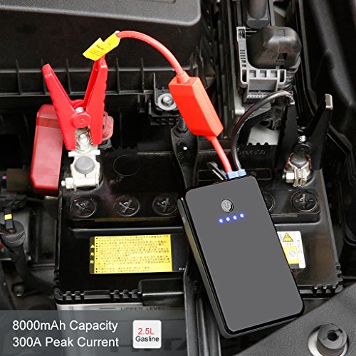 3-in-1 Solution: the fully charged 8000mAh capacity (300A peak) battery can boost your 12V vehicle (up to 2.5L gas engine), motorcycles, snowmobiles and motorboats, while the built-in flashlight and a USB port to keep your electronic gadget charged