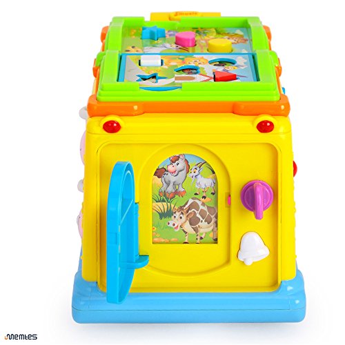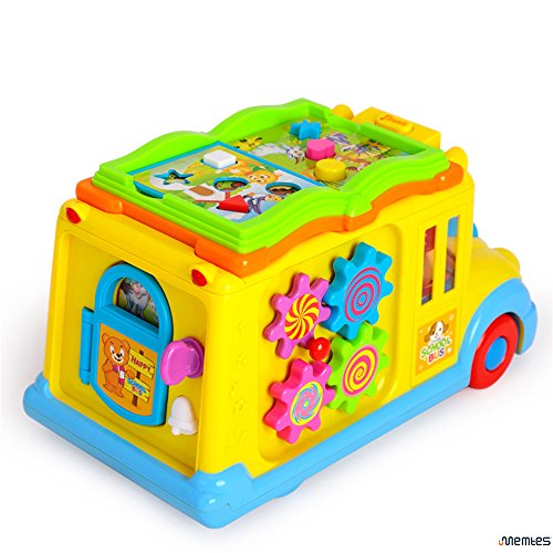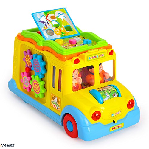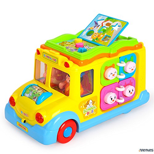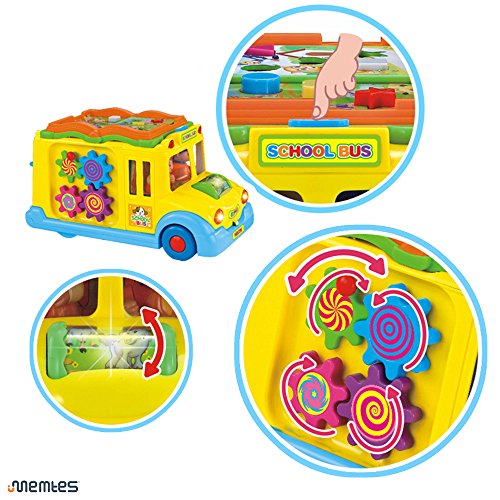 Memtes Musical Yellow School Bus Toy with Music Sound and Lights,Bump and Go Action Musical Toy Intellectual School Bus for children. Loads of functions including Music, Sounds, Flashing headlights, and bump and go action. Just turn on the school bus and watch as There is also an option to turn OFF the music. Cute toy passengers Swing from Side to Side. Turn the key to open the back door, and different animals will appear! Turn the pages of the books to hear different animal sounds and expressions. There are also turning gears on the side for children to touch and play. Ages 12 months+ 3 AA batteries required (not included)