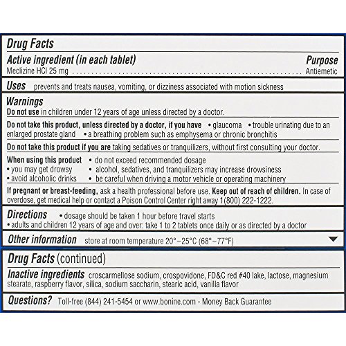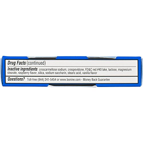 -. Binding : Health and Beauty -. Brand : Bonide -. Feature : Works up to 4 times longer and causes less drowsiness than original Dramamine / Bonine -. Label : Bonine -. Manufacturer : Bonine -. MPN : EMERSON573097 -. PartNumber : EMERSON573097 -. ProductGroup : Health and Beauty -. ProductTypeName : HEALTH_PERSONAL_CARE -. Publisher : Bonine -. Studio : Bonine -. Title : Bonine Motion Sickness Tablets-Raspberry-16 ct.