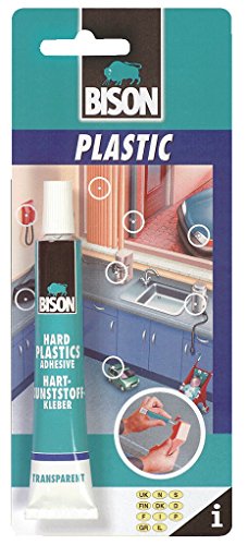 1 x 6305315 Bison Hard Plastics Repair Adhesive. 25ml tube with re-sealable lid. Bison hard plastic adhesive is super strong, temperature resistant and waterproof. The adhesive dries to form a rigid transparent bond. Ideal for general household repairs. Suitable for use on ABS, rigid PVC, polycarbonate and acrylic glass. Excellent for repairing telephones, mobile phones, toys, coffee makers, audio appliances, remote controls, computers, electrical tools and tubes, pipes, gutters, water boilers and car lights. Not suitable for use with PE, PP and PTFE.Feature