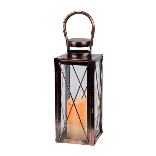 -. Feature : Beautiful 12-inch copper colored metal lantern with rigid glass panes is perfect for your deck or patio / Beautiful 12-inch decorative lantern / Metal in a copper color finish and rigid glass panes / Includes 3x4.5-inch indoor/outdoor LED candle with 5 hour timer feature, wavy edge design and soft glow flicker / Perfect for patios & decks