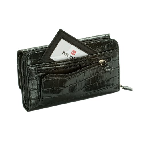 This Mundi wallet is packed with essentials to keep any woman organized. A removable checkbook holder includes a solar calculator. The wallet also includes 5 slots for photos or identification, 8 credit card slots a zipper compartment holds two large pockets and a zipper pocket as well. On the back is a zipper pocket which contains a removable ID case. Detailed Product Information:Color: Black CrocClosure: Zipper, SnapMeasures: 7.5" w x4" H x 1.75" D