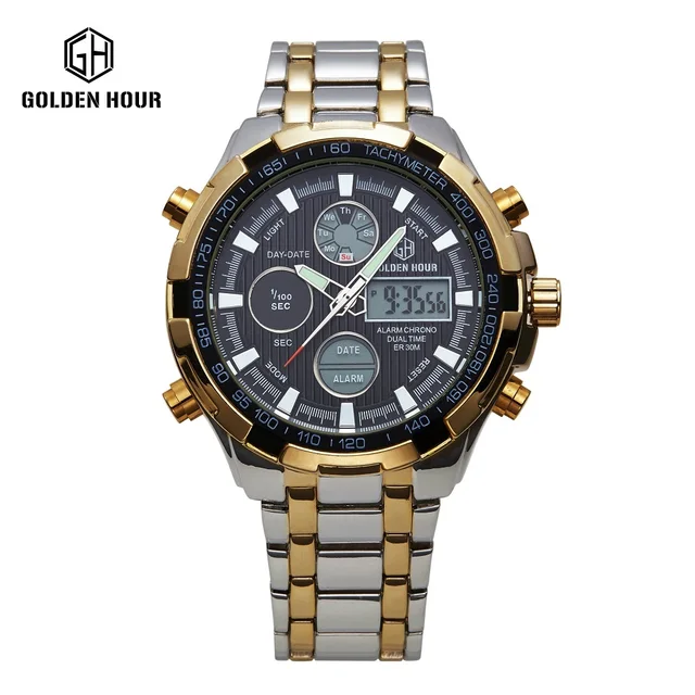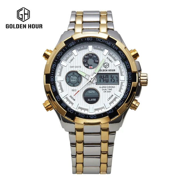 | [해외] 2017 패션 시계 남성 럭셔리 브랜드 골드 실버 황금 시계 남성 스포츠 석영 시계 듀얼 시간 Relogio Masculino Esportivo |