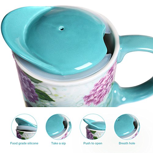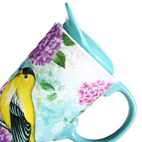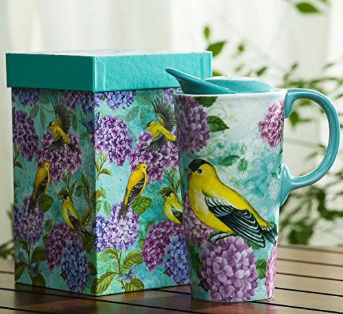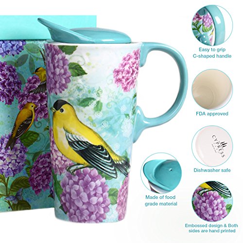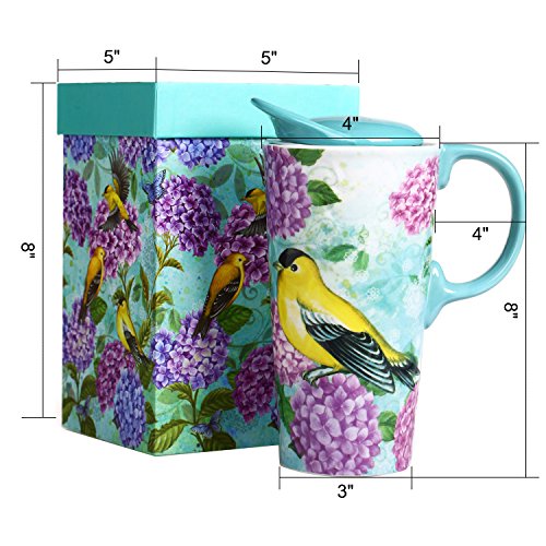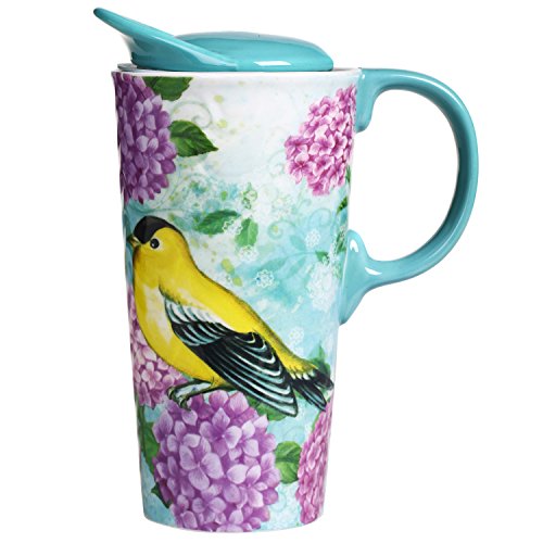 Travel Coffee Ceramic Mug Porcelain Latte Tea Cup With Lid in Gift Box 17oz. Goldfinches by CYPRESS