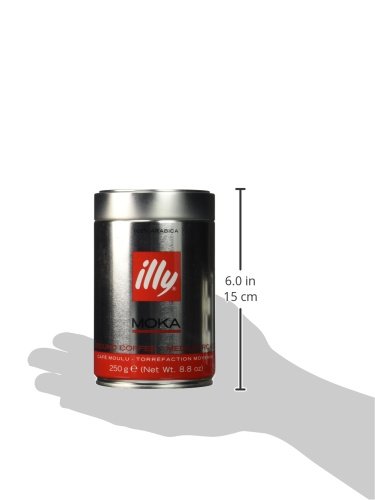 Illy MOKA ground espresso coffee, box of six 8.8oz coffee cans. Richly aromatic with a well-defined body, moka stovetop coffee is a morning ritual in most Italian households. Illy "Moka" is specifically created for the use with Moka pots and stovetop espresso makers. illy is packaged in a pressurized, protected, air-free environment to preserve freshness and lock precious flavors, aromas and oils inside the coffee until the can is opened and the coffee is prepared. For coffee connoisseurs and people who are passionate about coffee, illy's high quality and distinctive taste provide a perfect, memorable coffee experience.