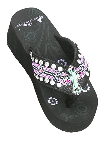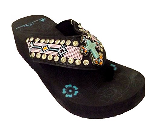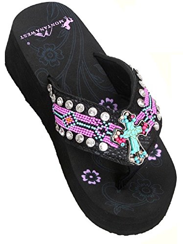 Product Description Turquoise cross and rhinestones are a unique feature on these hand beaded Montana West flip flops. Floral design with the Montana West logo is on the top of the sole. 0