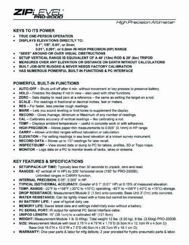 -. Binding : Tools & Home Improvement -. Brand : ZIPLEVEL -. Color : Yellow/Black -. EAN : 0815275010001 -. Feature : No line-of-sight required / Does not amplify error over distance / Never needs factory calibration / Displays level or elevations directly in digits - no calculations required / Set up ranges of 40 vertical feet over a 200' circle - unlimited ranges using its Carry Function -. Label : Technidea Corporation -. Manufacturer : Technidea Corporation -. Model : PRO-2000 -. MPN : ZLP-100 -. NumberOfItems : 1 -. PackageQuantity : 1 -. PartNumber : ZLP-100 -. ProductGroup : Home Improvement -. ProductTypeName : TOOLS -. Publisher : Technidea Corporation -. Studio : Technidea Corporation -. Title : ZIPLEVEL PRO-2000 High Precision Altimeter -. UPC : 815275010001 -. Warranty : 1 year warranty against manufacturer defects for parts and labor