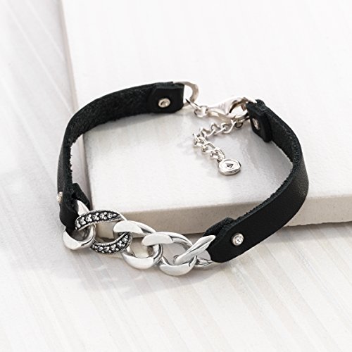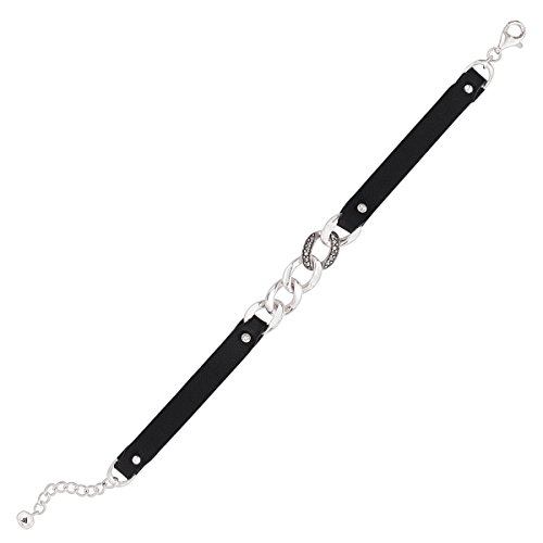 Five interlocked sterling silver links are brought together by leather bands on either side with one of the links studded with paved Swarovski crystal for an asymmetrical effect. Each band also features bezel-set Swarovski crystals for extra sparkle. Bracelet measures 6 1/2 inches in length (including a 1-inch extender), finished with a lobster clasp. Piece comes with a ".925" sterling silver stamp as a symbol of guaranteed product quality.