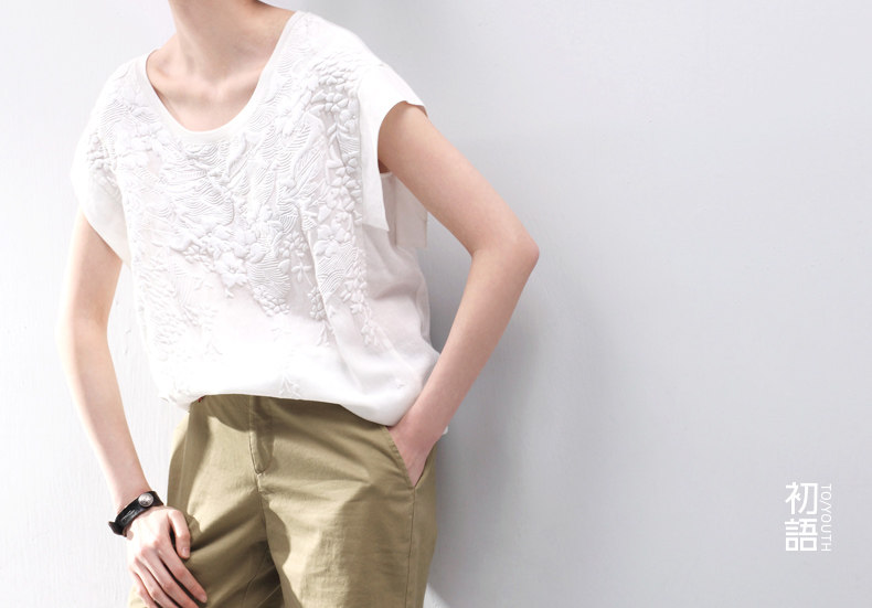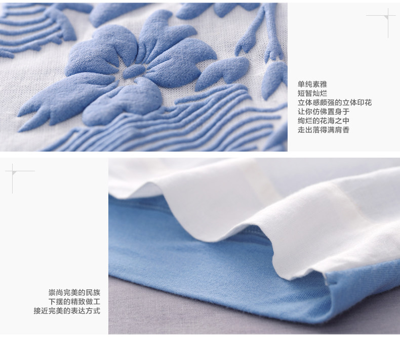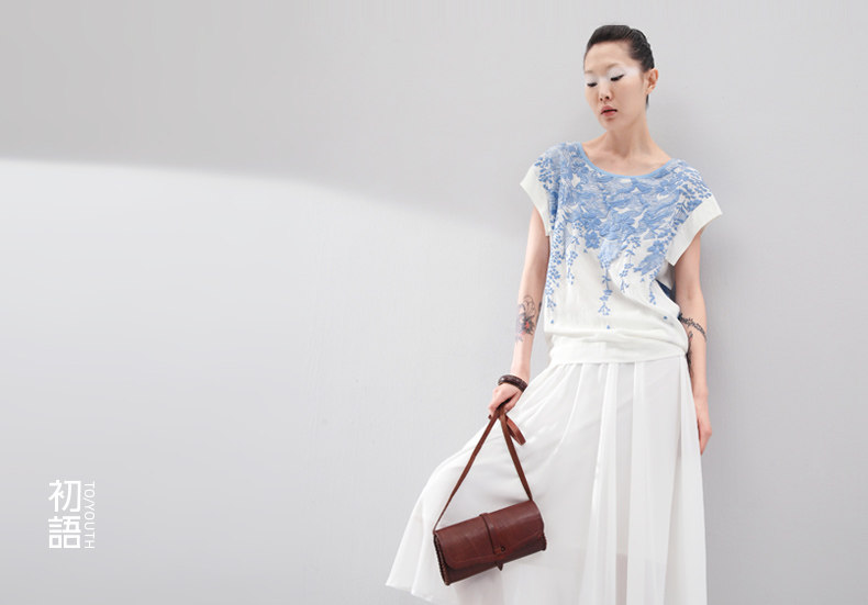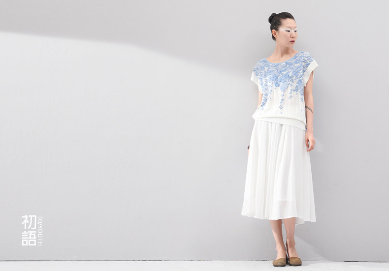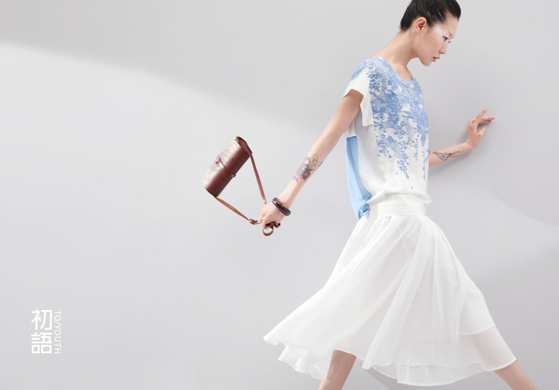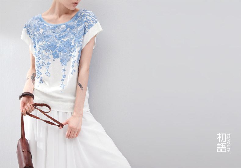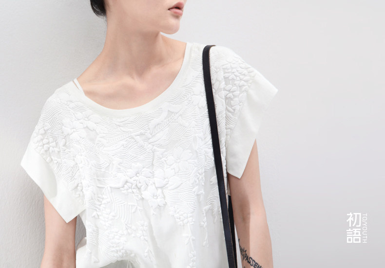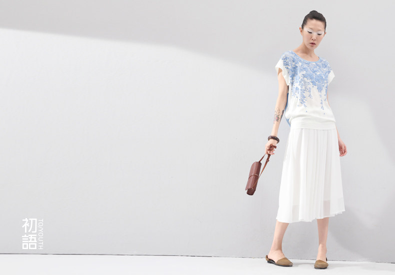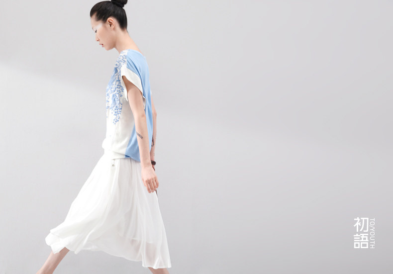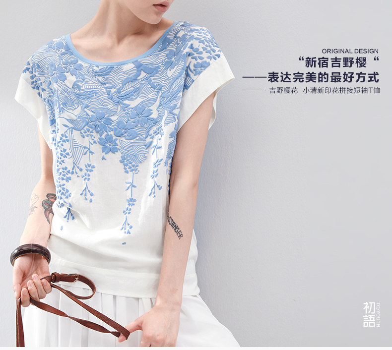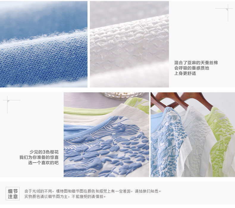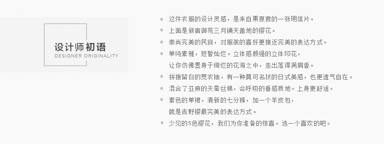 这件衣服的设计灵感,是来自栗原君的一张明信片。 上面是新宿御苑三月铺天盖地的樱花。 崇尚完美的民族,对服装的喜好更接近完美的表达方式。 单纯素雅,短暂灿烂。立体感颇强的立体印花, 让你仿佛置身于绚烂的花海之中,走出落得满肩香。 拼接留白的宽衣袖,有一种莫可名状的日式美感,也更透气自在。 混合了亚麻的天蚕丝棉,会呼吸的垂感质地。上身更舒适。 素色的单裙,清新的七分裤,加一个羊皮包,就是吉野樱最完美的表达方式。 少见的3色樱花,我们为你准备的惊喜。选一个喜欢的吧。