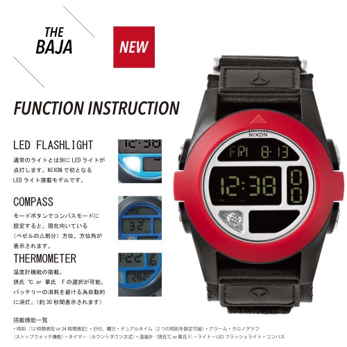 프라이빗과 비지니스.그 양방을 밸런스 잘 커버 하는 뉴 모델이 등장.THE BAJA(《바하》) 라고 이름지어진 모델 명(이름)는 멕시코의 지역명,BAJA CALIFORNIA 에 유래합니다.BAJA CALIFORNIA반도를 종단 하는 오프로드 카 레이스「BAJA1000」가 개최되는 것에서도 알려지는 동땅의 이미지를디자인에 떨어뜨려 포함습니다.몹시 거친 풍류가 없는 포름을 든 이 모델은,액티브한 움직임에 대응하는 라운드의 베젤이 액센트가 된 케이스 주위와,벨크로 스트랩을 채용했 독특한 밴드를 편성한 지금까지의 스포츠 모델에는 없는 오프로드 지향의 멋 를 가지고 있습니다.물론 내구성 이 뛰어난 설계에,폴리 카《보네이토케스》를 채용 하고 있는 외에,100M내수 기능도 구비한(갖춘) 수륙 양용의 올 설대《다》.그러한 종래의 터프이다에 덧붙여,듀얼 타임 알람 같은 비즈니스 현장과,강한 빛을 발하는LED 라이트 kompas 온도계 등 액티브 씬을 크로스오버하게 한 가제트를 탑재.지금부터NIXON 의 새로운 일익을 맡는다,신감각의 터프한 하이브리드 모델입니다./100M/10기압 방수/고해상도 디지탈 디스플레이/1224시간표시/데이 데이트 표시/듀얼 타임/크로노그래프/알람 / 타이머/기온 표시(섭씨/화씨)/LED플래쉬 라이트/kompas