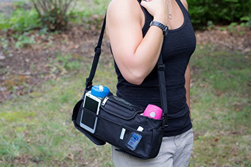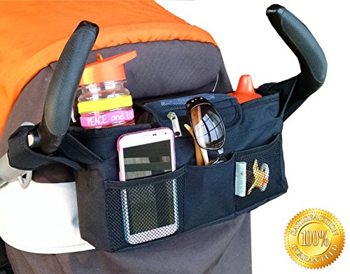 MOMWIZE STROLLER ORGANIZER (BLACK) FITS OVERSIZED PHONES AND WIDER STROLLER HANDLEBARS-WATER RESISTANT, INSULATED CUP HOLDERS, EXTRA STORAGE CAPACITY AND CONVERTS TO A DIAPER BAG