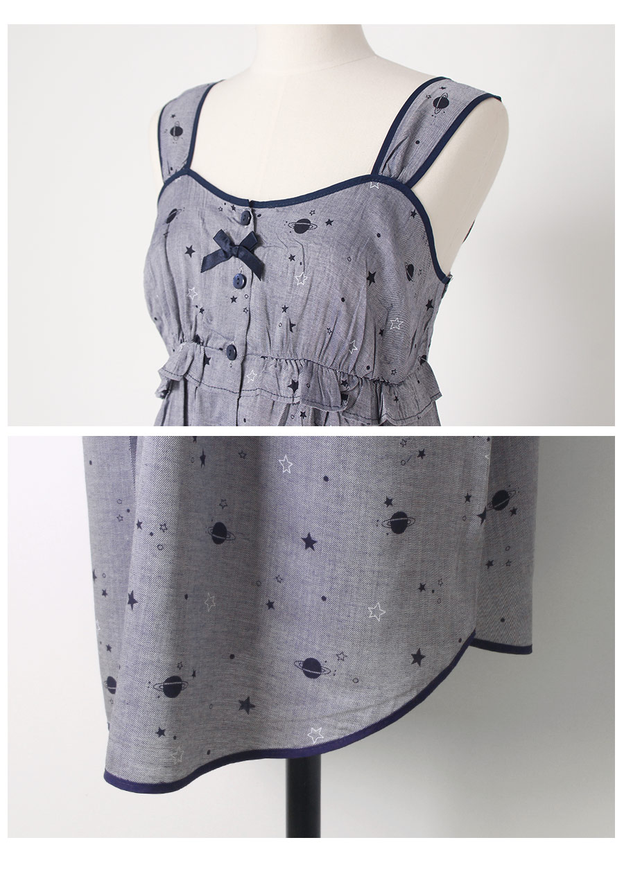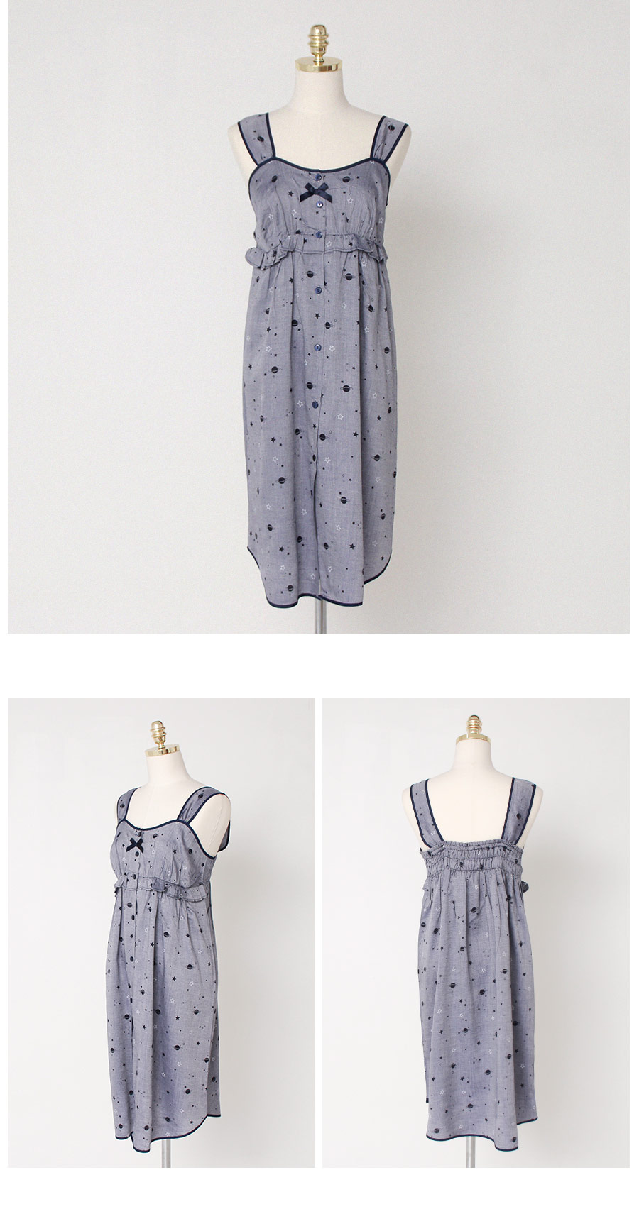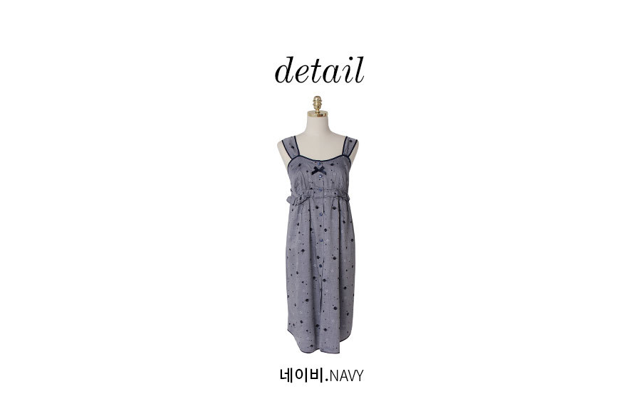 그레이네이비 컬러의 실을 고급스럽게 짠 원단 베이스 위에 우주 느낌이 나는 모티브를 쟈카드로 짠 원단이랍니다. 직접 개발한 원단으로 소장가치가 높은 고급스러운 원단의 잠옷이에요. 피부에 닿았을 때, 부드럽고 시원한 터칭감의 레이온 소재로 봄, 여름에 입기 좋습니다. 40수 레이온 소재로 탄탄하고 고급스러우며 드레이프성이 좋아 체형의 결점을 자연스럽게 보완해줍니다. DETAIL 네이비 컬러의 원단으로 깔끔하게 포인트를 준 디자인으로 심플하지만 돋보이는 고급스러운 디자인의 잠옷이랍니다. 바스트 라인은 곡선을 따라 패턴을 제작하고 볼륨감이 있어보이는 라인으로 실루엣이 더욱 예뻐보입니다. 안정감 있는 너비의 제천 스트랩으로 착용감이 좋습니다. 전체 클로징 버튼을 달아 탈 착용이 편리합니다. 뒷 부분은 3중 밴딩으로 안정감 있게 잡아줍니다. 곡선패턴을 응용해서 제작한 잠옷으로 깔끔하지만 디테일한 부분 하나까지도 놓치지 않은 스타일의 슬립웨어랍니다. 흐늘거리는 소재인 만큼 까다로운 봉제 작업이 들어간 슬립웨어로 소장가치가 높습니다. 고급스러운 컬러감과 디자인이 돋보이는 슬립웨어로 강력추천해 드립니다. 100%국내 제작으로 소재, 디자인, 봉제의 퀄리티가 높습니다. SIZE 44반~66size까지 커버 가능한 free사이즈 입니다.