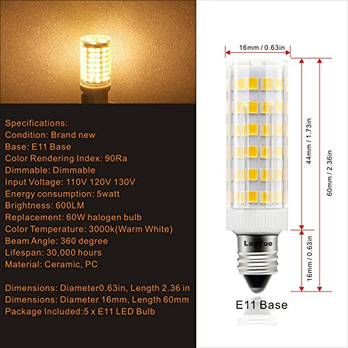 - 1. Super Brightness - LanYue use high lumen LED Chip,only 5 watts can be up to 600 lumens at brightness,replaces 60 Watt E11 halogen Bulb,Installsl e11 base fixtures directly. save up to 90% on your electricity bill.
