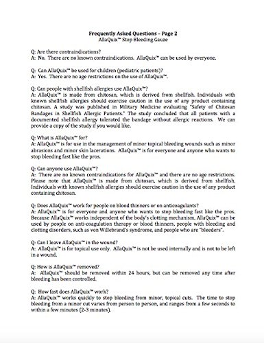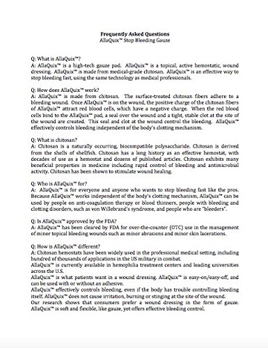 AllaQuix is a patented, high-tech gauze pad made of chitosan, which has been used and proven by medical professionals and the US Military to stop bleeding fast. AllaQuix is a sterile, topical, active hemostatic, wound dressing designed to stop bleeding fast. FDA CLEARED Reviewed and cleared by FDA for OTC use in the management of minor topical bleeding wounds such as minor abrasions and minor skin lacerations.