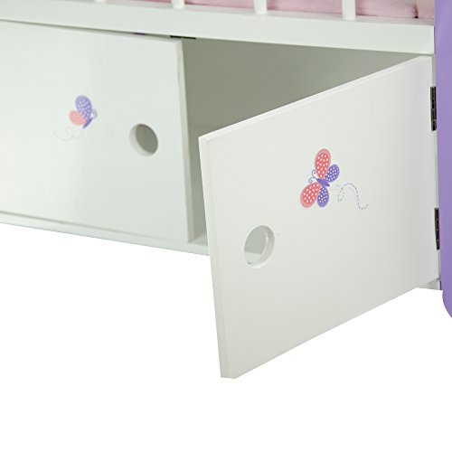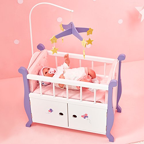 Does your sweet baby doll need a special nursery bed of her own? Bring them home the luxurious white and purple trimmed crib today. It comes with matching mobile with yellow stars, pretty floral design on the backing of the crib and storage space below with two doors that open up to store extra bedding. Baby can fall asleep on the soft pink pad that is inside the crib.