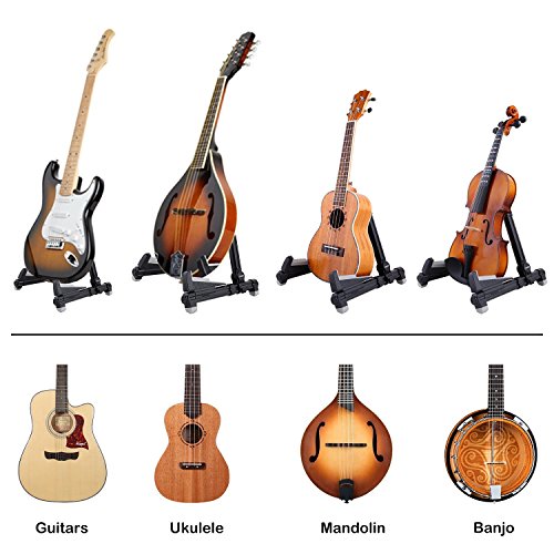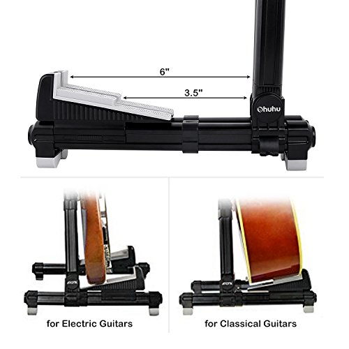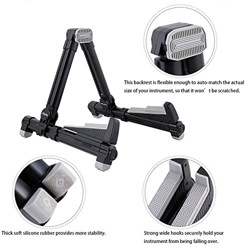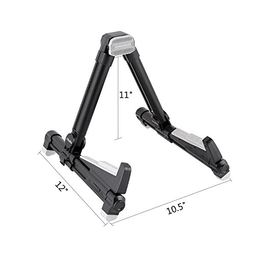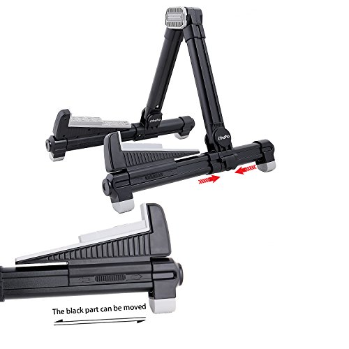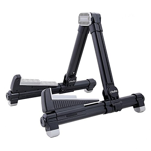 Studio : Ohuhu Publisher : Ohuhu Product Description Made to fit your instrument like hand in glove, this guitar stand by Ohuhu sets the key for musical accessories. Engineered from a durable aluminum alloy, the stand's A-frame is sturdy, with frame locks that keep the legs from sliding around. Silicone pads on the stand's arms provide added grip and prevent your guitar from getting scratched against the metal.
