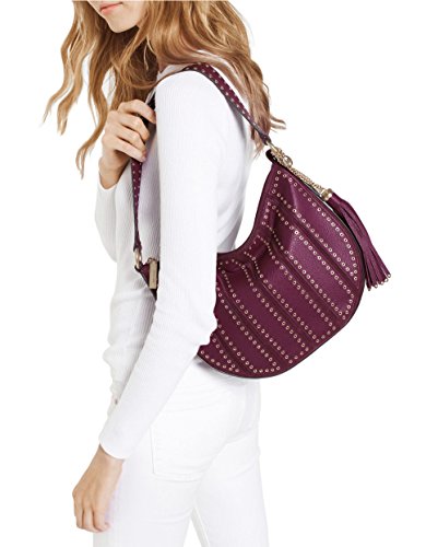 -. Feature : Suede, leather; lining: polyester / Exterior features brushed gold-tone hardware, grommet detail and tassel accent / Interior features lining, 1 zip pocket, 3 open pockets, 1 cellphone pocket and key clip / 9"L single handle; 23"L adjustable strap / 12"W x 9"H x 2"D