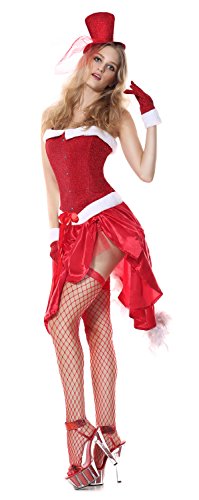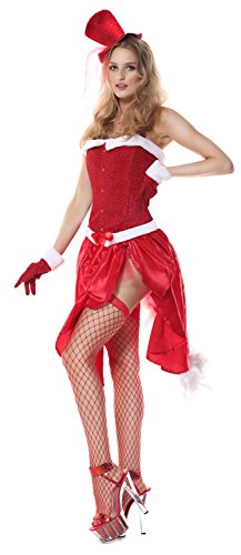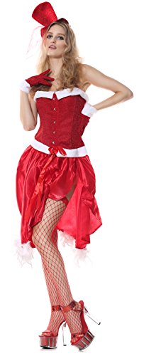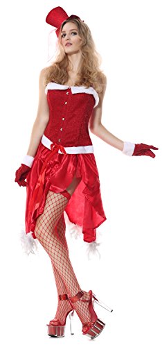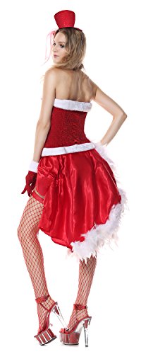- Feature : Please check our size chart details in Product Description / Draped red skirt with white marabou back feather detail / Includes a red corset, faux fur satin skirt, sparkle hat, gloves and g-string / Sell Only by Ecilu clothing