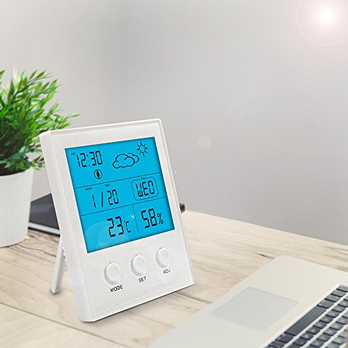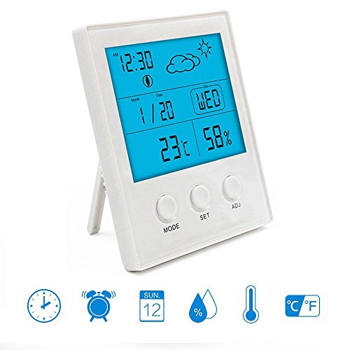 Studio : Intsun Publisher : Intsun Binding : Kitchen Product Description Function description of back button: ♥ Press "LIGHT" button, the screen will on 5s ♥ "LIGHT" button is also with SNOOZE function. ♥ Press"RESET" button, the product restore to initial state. Set time, date, week: ♥ At initial state, press"SET" button for 3s to get into 12/24 hour mode, and press"ADJ" select 12hr mode, ♥ press the"SET"again to get into the time setting, press"ADJ" to adjust the time upwards. ♥ press the"SET"again to switch to minute setting, press"ADJ"to adjust the data upwards, after setting, press"MODE" to confirm. ♥ Press"MODE"again to get to date setting. Press"SET"button for 3s, press"ADJ"to adjust the year data upwards. ♥ Press"SET"again and shift to month set, press"ADJ"to adjust the time upwards, ♥ Third press"SET"and shift to date set, press"ADJ" to adjust the time upwards, press" MODE" to confirm. ♥ Week Set: the day of the week will automatically change with the date set. Set Alarm, Snooze: ♥ Press"MODE" button shift to alarm time set. Hold"SET" for 3s, press"ADJ" to adjust the data upwards, press "SET" again and shift to minute set, press"MODE" to confirm. ♥ After that, press"ADJ" to turn on/off alarm function(display icon or not), When alarm clock at default time, it will sound BBB, press"ADJ" turn off the alarm, when press"LIGHT" at back, it into snooze state, the alarm doesn't sound, the snooze icon display and keep flickering, the alarm will sound again 5 minutes later. ℃/℉ "MAX/MIN" operation: ♥ Press"SET" to switch ℃/℉, press"ADJ" to check max/min temperature and humidity memory, the memory is for powered on or after pressing "RESET" Package includes: 1x Intsun Temperature and Humidity Monitor 1 x User Manual 0