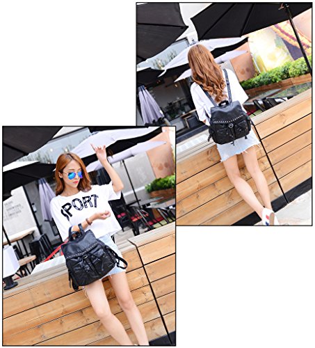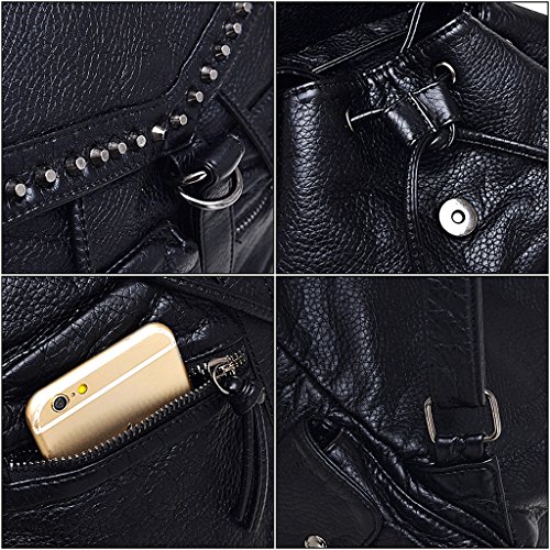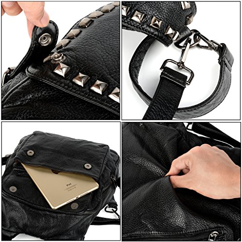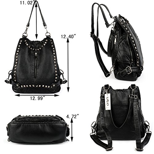 -. Brand : UTO -. Department : womens -. Feature : HIGH QUALITY - Ultra soft synthetic washed leather with modern black hardware, waterproof and anti-scratch. 2 adjustable/detachable back straps and 1 removable top loop handle. / WELL DESIGN - Rivet studded design on flapover. Detailed streamlined stiching. Full-lined coffee fabric lining. / LARGE CAPACITY - Interior: 1 magnetic closure pocket, 1 large zipper compartment contains 1 internal zip pocket and 2 open pockets. Exterior: 1 front zipper pocket and 1 back zipper pocket. / EXTREMELY PRACTICAL - Comfortably holds a 12.9" iPad Pro, tablet or a laptop 12" and under. Exterior pockets can hold your smartphone, iPad Mini and other essential items. / DIMENSIONS - 12.99"L x 4.72"W x 12.40"H. Weight: 2.12 pounds. Adjustable back straps: 70.07"(longest size). Handle drop: 11.02". -. ProductGroup : Shoes -. ProductTypeName : HANDBAG -. Title : UTO Women Backpack Purse PU Washed Leather Rivet Studded Convertible Ladies Rucksack Shoulder Bag Black