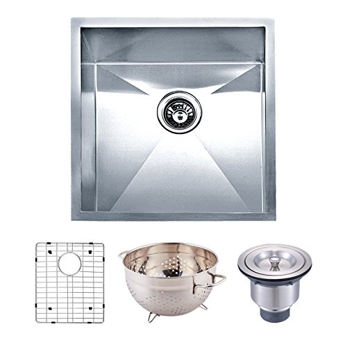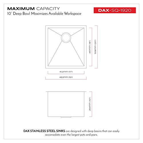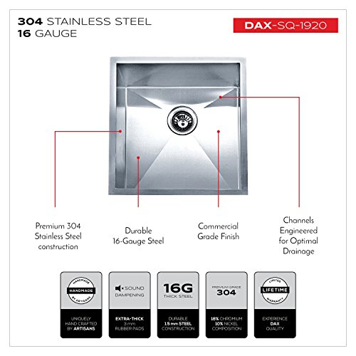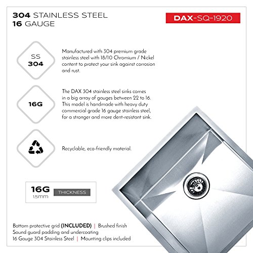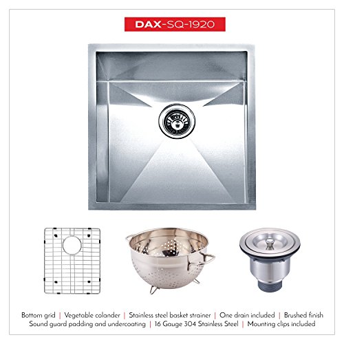 DAX Handmade Single Bowl Undermount Kitchen Sink, 16 Gauge Stainless Steel, Brushed Finish, 19 x 20 x 10 Inches (DAX-SQ-1920)