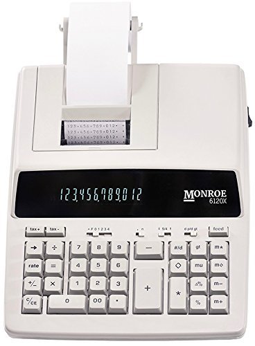 As the inventor of the commercial calculator in 1912, Monroe has earned the trust of fortune 500 companies, non-profit organizations and government agencies, including the likes of NASA. Monroe has since developed an entry level medium-duty calculator that will outlast and outperform competing models. The Monroe 6120x offers the best value in its category. With a 12-digit display and a print speed of 3.6 lines per second, the simple design and adding machine functionality make the 6120x perfect for small businesses, office, or home use. The Monroe 6120x places a wide array of productivity oriented features at your fingertips. This model contains a 4-key independent memory. Rounding may be set to standard, 5/4 rounding, round up, or truncate. Use the backspace key to correct entries, or the cost-sell margin feature to compute profit margins. The addition of extra-large plus and minus keys help make the Monroe 6120x a favorite among 10-key users. The 6120x may be used as a printing or display only calculator. Those who know, choose Monroe. - 12-digit print/display - 4-key independent memory - group, grand total, tax, tax + and tax -, n-count, mark-up, - - mark-down - percent, % +, % -, percent change - decimal settings: +,f, 0, 1, 2, 3, 4 - backspace and error correct features - black & red print with print speed of 3.6 lines per second - perfect for small businesses, office, or home use. Includes: - Monroe 6120x printing calculator, paper roll, and ribbon spool. Paper: 2 1/4" single ply paper tape ribbon: p65m (twin spools) or the Monroe m33x ribbon cartridge. Calculators being substituted for the Monroe 6120x line: canon: mp11dx, p23-dhv, mp25dv, mp21dx, p170dh Casio: fr-2650tm, dr-210tm Innovare: 16000 sharp: EL2192RII, EL2196BL victor: 1220-4 two-color, 1228-2 two-color, 1297 two-color, 1230-4 fluorescent.Feature