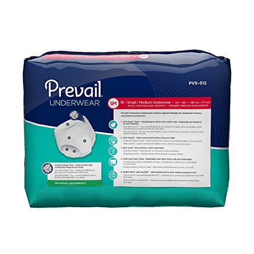 Small/Medium size fits waist sizes 34 to 46 inches for a snug and comfortable fit. Each Prevail incontinence product features a proprietary Quick Wick layer of material with MaxSoft Technology that provides advanced softness with rapid liquid absorption for optimal product performance.