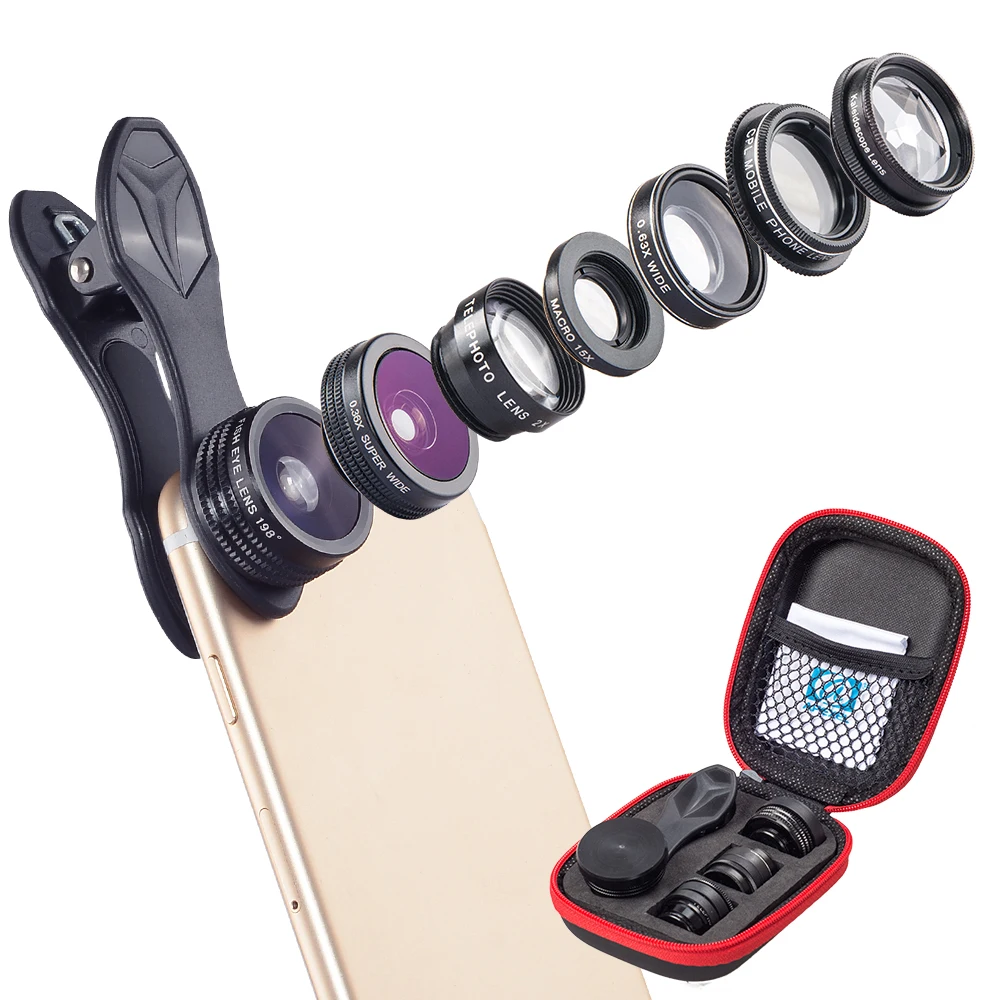 APEXEL 7 in 1 Camera Lens Kit Universal Fish Eye + 2 in 1u0026nbsp;Wide Angle/macro Lens + CPL+ Kaleidoscope and 2X telephoto zoom Lens for iPhone 6s 7 DG7