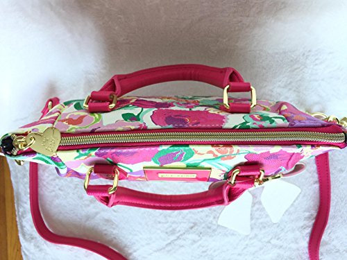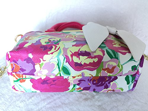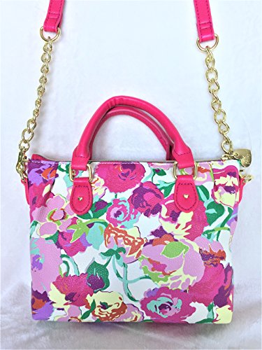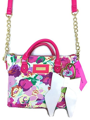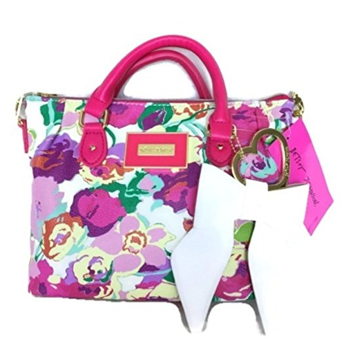 Multi-color Floral PVC Body & Trim with Front accented with White color bow & Betsey Signature name plate. Zippered closure.Signature Polyester Floral inner Lining. Outside Dimensions of the purse are: Length: 10.25" x Height: 7" x Depth: 3" Short Dual Strap drop: 4.5" Longer Chain-Leather combo Strap drop: 23.5"