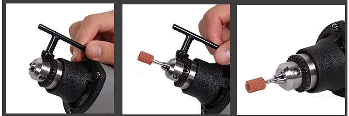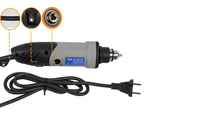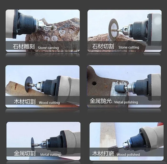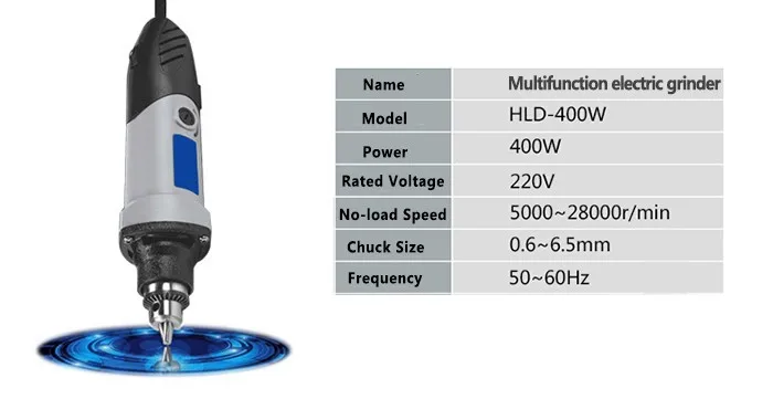 Scope of application : stone carving,stone cutting,wood cutting,metal polishing,metal cutting,wood polishing Rated input power : 400W Voltage : 220V Frequency : 50~60Hz No load speed : 5000~28000r/min Plug type: European standard Collet : 0.6~6.5mm Net weight : 0.95kg