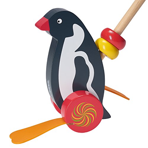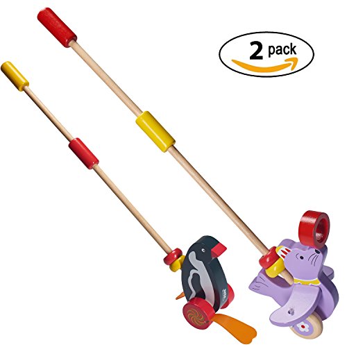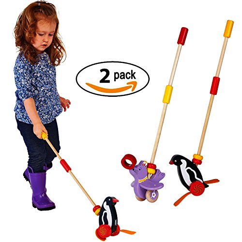 This wooden 2 pack push along toy includes an adorable Sea Lion and Penguin. Your toddler will love pushing along this adorable penguin as its feet make a flip-flop sound. Push the sea lion to see its flippers move in an up and down motion. These push and pull toys will help to promote walking and balance. Will provide hours of fun once your child finds their balance. Recommended for ages 18 months and up. All our toys comply with international toy safety standards and are made from renewable resources with non-toxic paints & lacquers. Please note: Color shades may slightly vary from images.Feature