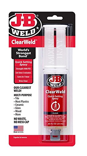 J-B Weld ClearWeld SyringeClearWeld is a quick setting, multipurpose two part epoxy that provides a strong and lasting bond on most surfaces including tile, most plastics, ceramic, glass, wood and metal. ClearWeld is designed to cure with a clear, transparent bond when used at thicknesses of less than 15 mil. ClearWeld has a 1:1 mixing ratio, sets in 5 minutes and cures in 1 hour. With a tensile strength of 4400 PSI, ClearWeld sets to a hard, permanent bond.