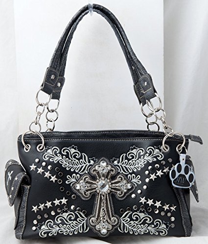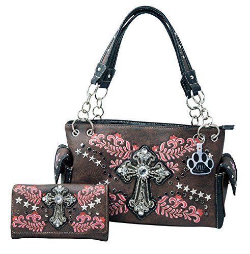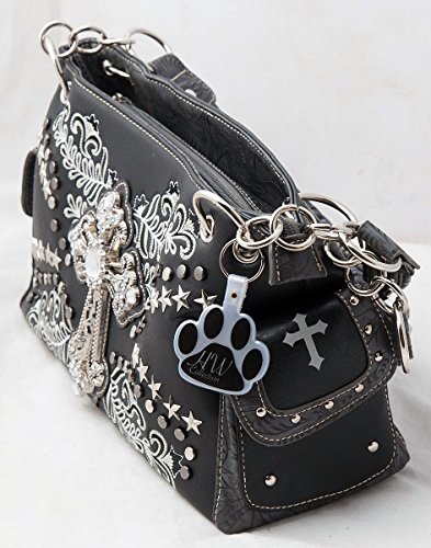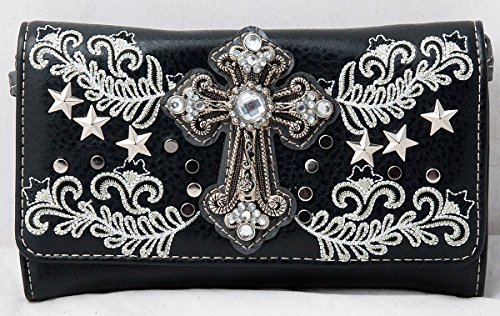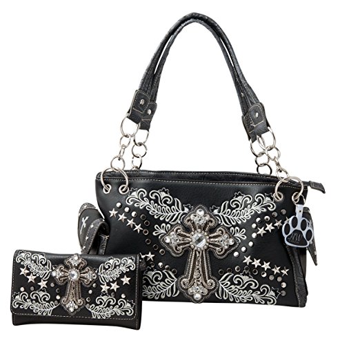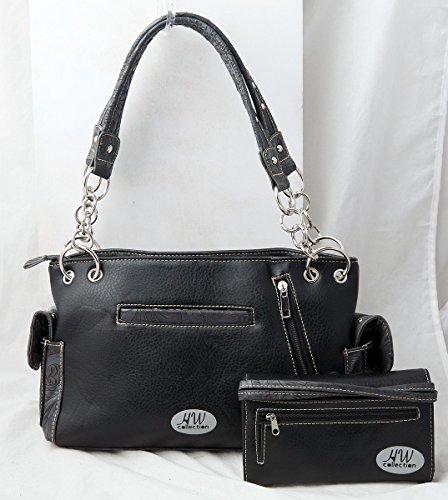 Western handbag is made from high quality premium faux/imitation PU leather with silvertone studs and stars, colorful embroidered leaf/vine designs, silvertone cross with rhinestones, and detachable HW Collection key ring/purse charm on the front. Secure your possessions with its zip top closure. Spacious with its single compartment fabric lined interior, front wall that has 2 open pouch pockets and a zippered wall pocket on inside rear. One secure zippered pocket on the back for a concealed carry handgun (10 inches long x 6 inches tall) and one open pocket that can fit 5 inch phone. Double flat chain handles. Two side pockets with a cross on the flap that snap closed magnetically and can store your tissues, lipstick or any items you need to access quickly and easily. Metal feet on the bottom to keep the bag clean, protected and stable. Suitable for work, shopping, vacations, evenings out with friends or just to stand out and show off your western bling style. Top handle bag is 13 inches long X 9 inches tall x 5 inches wide. Matching wallet/clutch has a single, removable strap to convert the trifold wallet into a wristlet and a single, long removable shoulder/crossbody strap. Snap closure. Flat currency compartments, expanding accordion area for coupons or receipts and a zippered pocket on the inside for coins. 9 slots on the inside for credit cards, ID, or business cards and 3 clear ID windows. Zippered and slide pocket on the back. 7.5 inches long X 1.5 inches wide X 4.5 inches tall. Aside from use as a wallet, it is great for occasions when you don't want to carry a big handbag and just want to bring the essentials so by using one of the straps you can be hands free!Feature