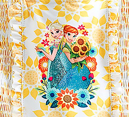 Swimsuit features Anna and Elsa screen art with glitter detailing, side panels of smocking, ruffled trim and straps. Body: 80% polyester / 20% spandex, lining: polyester.
