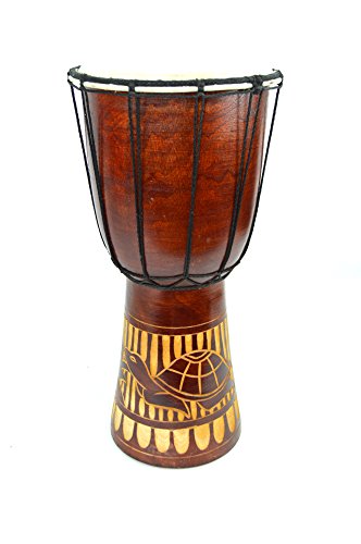 Product Description THIS AMAZING DRUM IS MADE OF ONE SOLID PIECE OF MAHOGANY WOO WITH PREMIUM QUALITY GOAT SKIN HEAD. ALL DRUMS ARE PROFESSIONALLY HAND-PRODUCED WITH A STRINGENT QUALITY CONTROL. EACH DJEMBE IS SPECIALLY CRAFTED WITH SOUND QUALITY AND PLAY-ABILITY IN MIND, WITH ADDITIONAL ATTENTION GIVE TO AESTHETICS. DRUM FEATURES: -LEGALLY HARVESTED, ENVIRONMENTALLY SUSTAINABLE MAHOGANY WOOD, ONE-PIECE, SOLID SHELL CONSTRUCTION -PREMIUM SELECTED GOATSKIN DRUM HEADS, WITH NATURAL, AUTHENTIC LOOK AND SOUND -LATHE TURNED FOR UNIFORM THICKNESS -LATERAL GROOVE/ROUGH SURFACED CARVINGS ON INTERIOR BOWL TO REDUCE OVERTONES -SHELLS ARE KILN DRIED WITH UP TO 20 COATS OF TEAK OIL TO PROTECT AND PRESERVE THE WOOD -5 MM INTERNALLY BRAIDED PREMIUM NON-STRETCH ALPINE ROPE -EXTRA TUNING ROPE WRAPPED AROUND THE NECK FOR MALI WEAVE TURNING. SIZE IS 16"H X 8 X 8. Handmade- Allow for variations in size and carving. Design and turtles are all a little different. 0